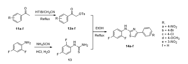 By considering the wide range of applications of aminothiazoles and in continuation of our interest in hypervalent iodine [I(III)] mediated approach, we attempted the syntheses of some novel fluorine based 2-aminothiazoles (7a-g, 10a-c and 14a-f).