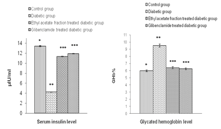 Fig. 1: Protective efficacy of ethyl acetate fraction or glibenclamide on serum insulin and glycated hemoglobin levels in streptozotocin-induced diabetic rat. Each bar represents Mean ± SEM, n=6. ANOVA followed by “Multiple Comparison two tail ‘t’ test”. Values of bar diagram with different stars (*, **, ***) differ from each other significantly at the level of p<0.05.