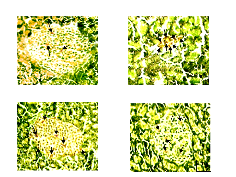 Fig. 2: Immunohistochemistry of Pancreas; ISEL Study, X 400 indicates apoptotic cells. (A) Representative microphotograph of pancreatic section showing normal density of islet cells and very few apoptotic cells in islet present in the control group identified by ISEL study. (B) Microphotograph of pancreatic section showing increase in the number of apoptotic cells in islet present in diabetic rat by ISEL study. (C) Representative microphotograph of pancreatic section from ethyl acetate fraction treated diabetic rat showing low number of apoptotic cell in islet identified by ISEL study in compare to diabetic group. (D) Microphotograph of pancreatic section from glibenclamide treated diabetic rat with low count in apoptotic cells in islet in respect to diabetic group.