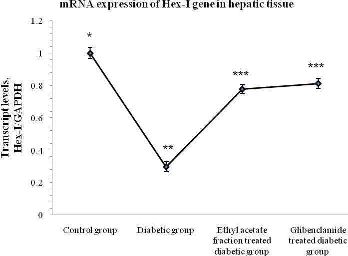 Down ward expression pattern of the hepatic Hex-I gene in diabetic group was noted by qRT-PCR analysis when compared with the expression pattern for the same in the control group. A significant remedial activity of ethyl acetate fraction or glibenclamide was noticed in the said gene expression in target tissue after treatment to diabetic group (Fig 3).