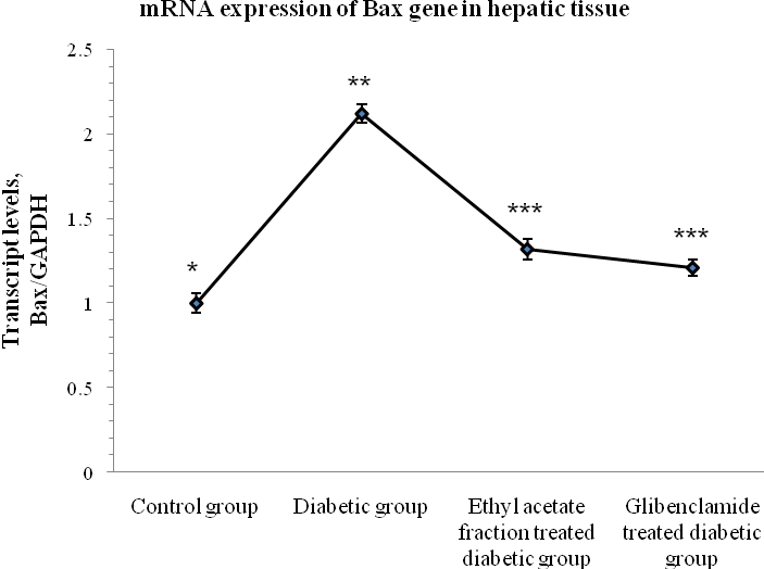 Pro-apoptotic marker, Bax was increased and anti-apoptotic marker Bcl-2, was decreased significantly (p < 0.05) in hepatic tissue in diabetic group with respect to the control group by qRT-PCR analysis. After the treatment of said fraction to diabetic rat for 35 days, a significant recovery (p < 0.05) was observed in the expression pattern of hepatic Bax and Bcl-2 genes towards the control group (Fig 4, 5).