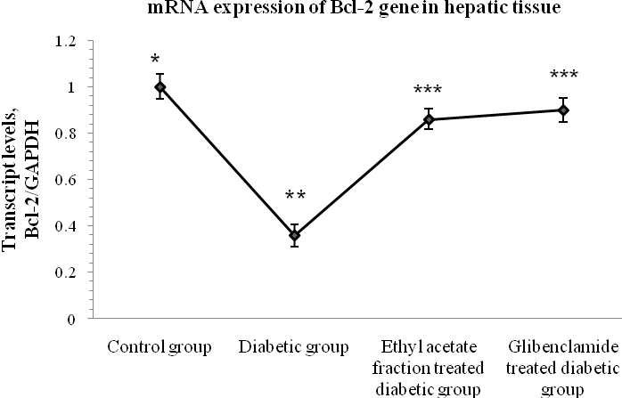 Fig. 5: Representative qRT-PCR analysis of hepatic Bcl-2 gene expression in rat after normalizing the result with housekeeping gene, GAPDH. Data represents mean ± SEM, n=6. ANOVA followed by “Multiple Comparison two tail ‘t’ test”. Different stars (*, **, ***) differ from each other significantly at the level of p<0.05