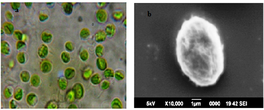 Fig. 1: Morphological study of marine isolate Chlorella sp._PR1 a) Light microscopy at 100 × magnification; b) Scanning Electron Microscopy at 10,000 × magnification