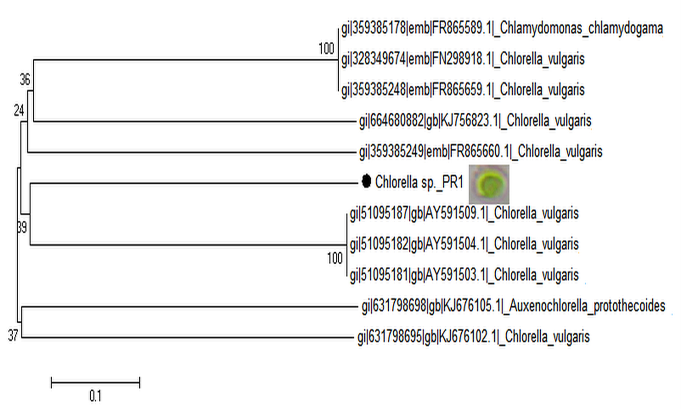 Multiple sequence alignment (MSA) of the ITS sequences was aligned by CLUSTALW embedded in MEGA 5.0. The phylogram (Figure 2) provided the confirmation that the isolated Microalgae belonged to Chlorella sp. Based on sequence homology and phylogenetic analysis Chlorella sp._PR1 belongs to Chlorella vulgaris (Accession no. 51095187).