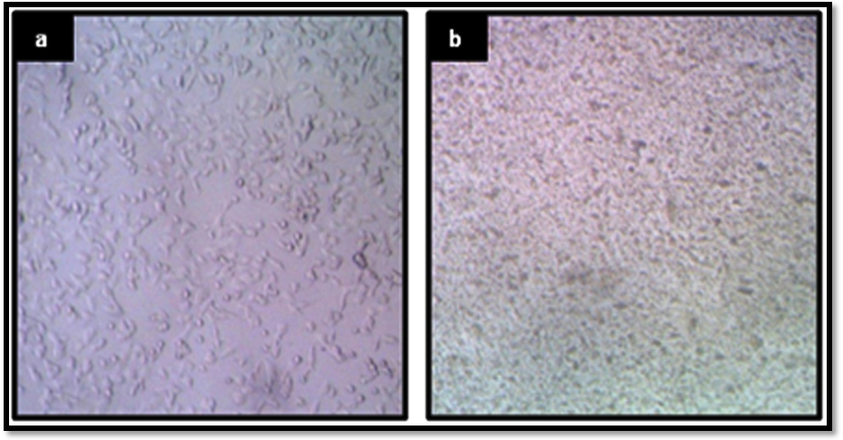 Fig. 3: Morphology of murine melanoma cell line B16F10 (a) without any treatment; (b) after treatment of Chlorella sp._PR1.