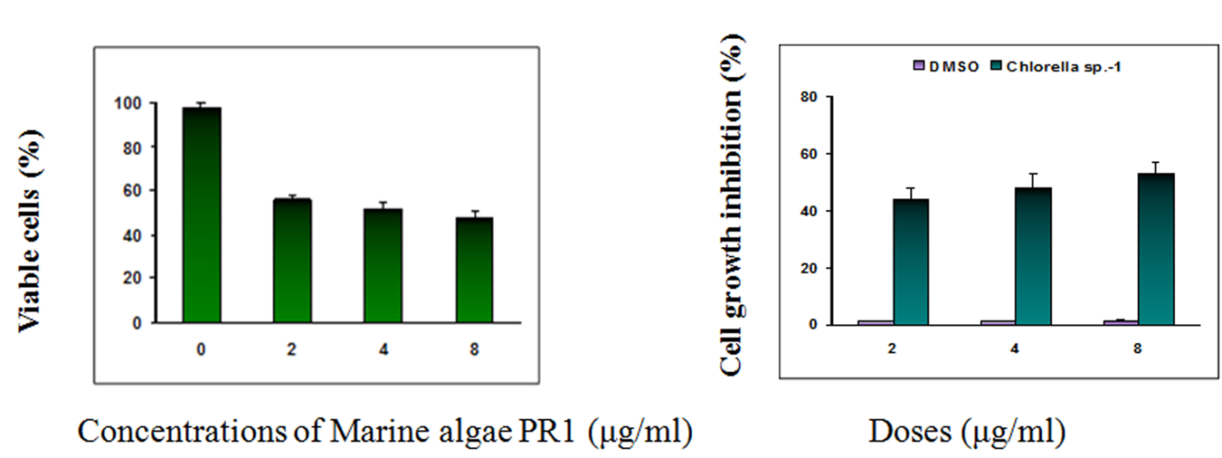 Algal cells were harvested in early log phase and centrifuged at 5000 rpm for 10 min. The pellet was dried and stored at 4˚C for further use. 1 mg of dried algal powder of Chlorella sp._PR1 was dissolved in dimethyl sulphoxide (DMSO). The selected doses were 2, 4 and 8 µg/ml and the corresponding doses of vehicle control were also tested to observe the effect of DMSO on the cells.