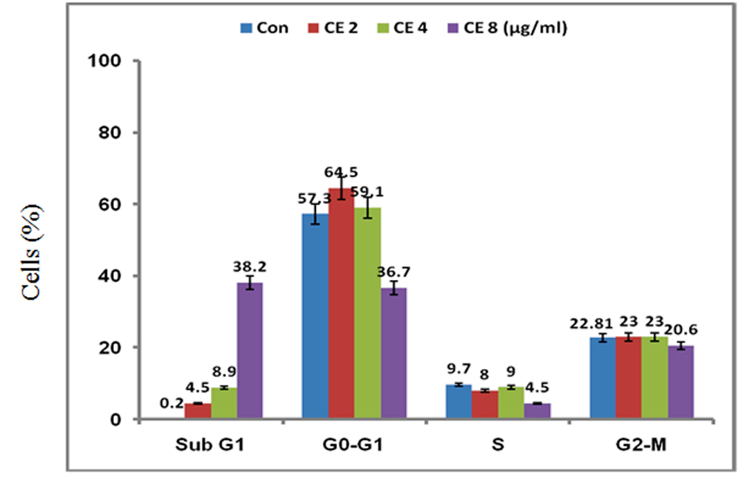 Fig. 5: Comparative representations of the cells (%) at different stages of the cell cycle with various doses of Chlorella sp._PR1. Extract (CE). The extract showed a significant dose dependent increase in the percentage of sub G1 cells (*p<0.01) in comparison to the control cells. Highest dose of CE (8 µg/ml) significantly inhibited G0-G1 and S phase (*p<0.01) of B16F10 cells.