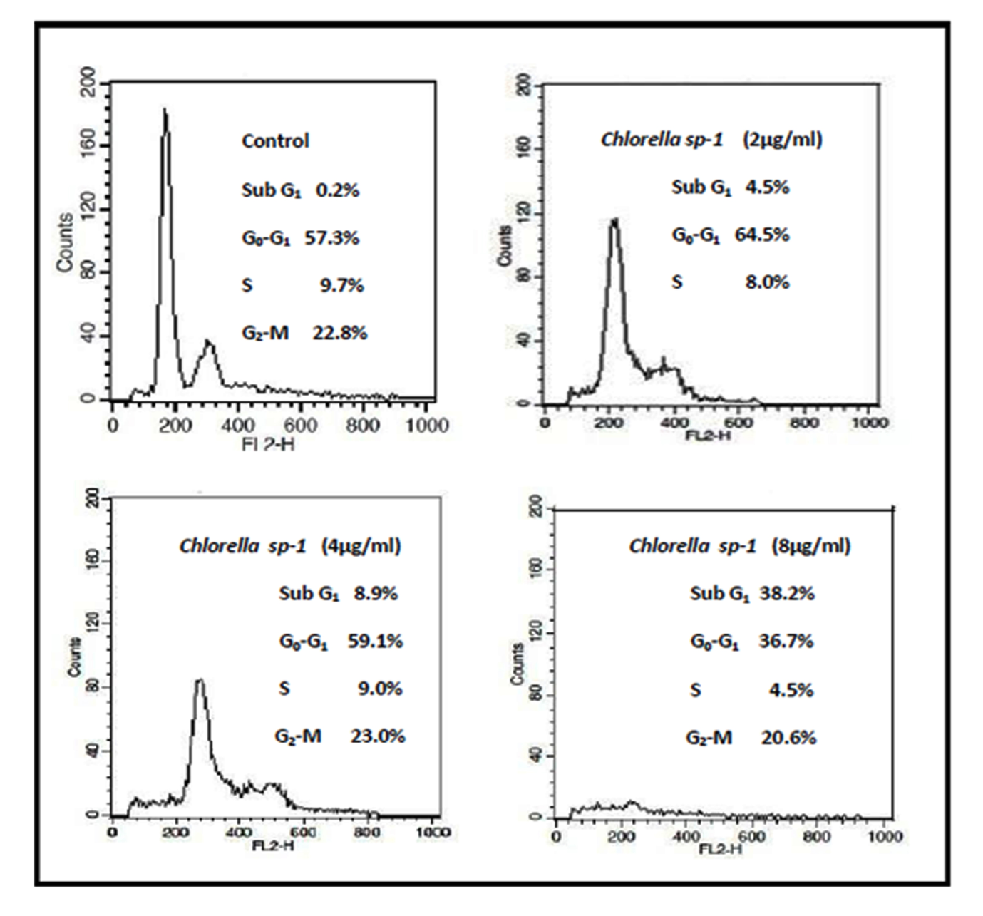 Fig. 6: FACS analysis showing dose dependent apoptotic effect of Chlorella sp._PR1 extract on cell cycle of B16F10 cells as evidenced by an increase in sub G1 peak.