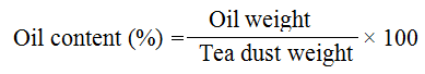 The oil content was extracted from green tea leaves by soxhlet apparatus using petroleum ether as a solvent for 6 h according to the american oil chemists’ society (AOCS) method [11]. At first 1 kg green tea leaves were soaked in warm water at 60 °C for 5 minute and discard the water for removing the water dissolving compounds from the tea leaves. Then the wet tea leaves was dried at 40±1 °C in an incubator and the dried parts were crushed in an electric grinder machine and fine dust (800 gm) was collect for the experimentation [12]. Dried and finely powdered dust (800 gm) was dissolved in hexane: isopropanol (3:2; v/v) on an airtight glass jar for 24 h and allow it for shaking incubation at 37 °C and filtered through Whatman No.1 filter paper and the filtrate was collected. Then filtrate was evaporated by a rotary evaporator at 40 °C. The collected part was content total oil.