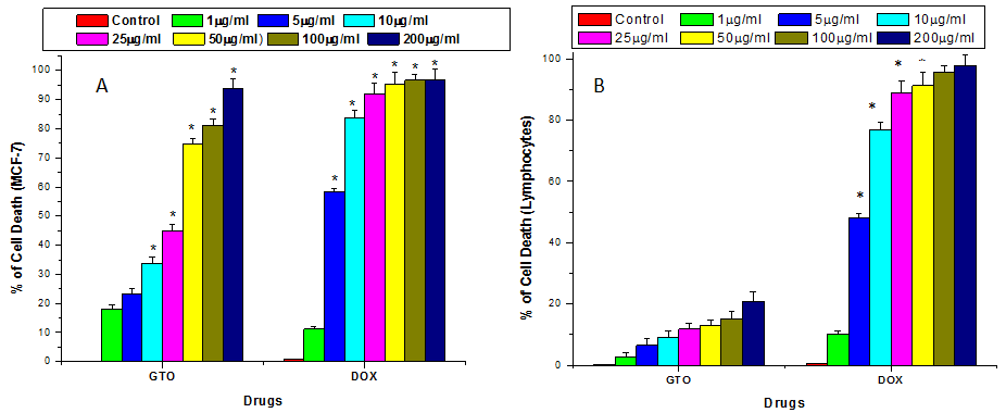 Fig. 1A and 1B: In vitro cell death assay of drug treated, DOX-treated MCF-7 and Lymphocytes were measured by the MTT method as described in materials and methods, values are expressed mean±SEM (n=6), symbol indicates the difference significantly each other