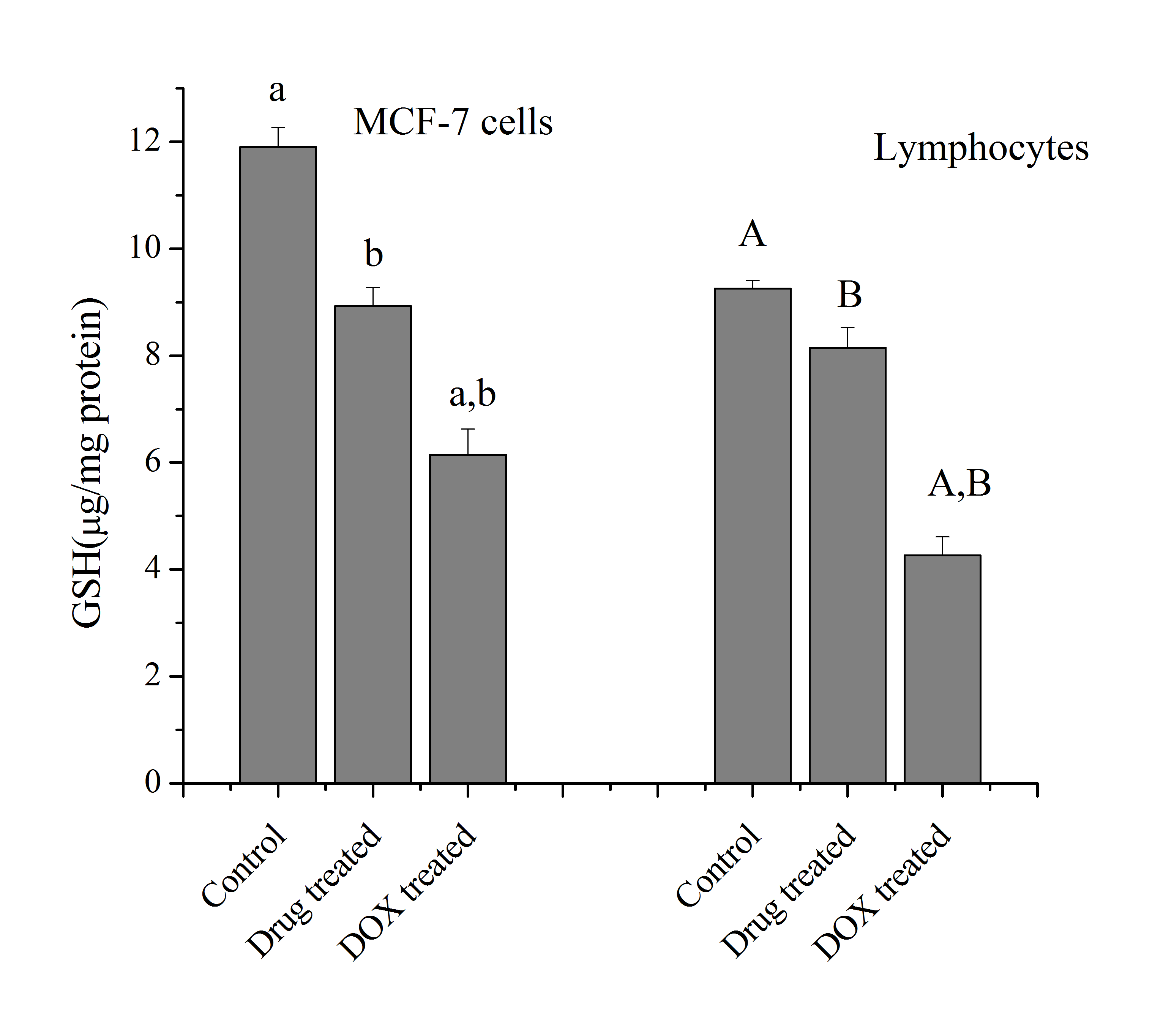 Fig. 2: Intracellular reduced glutathione (GSH) levels of drug-treated and DOX-treated MCF-7 cells and PBLs. The levels of GSH were expressed as mg of GSH/mg protein. Values are expressed as mean±SEM (n=6) of three experiments; superscripts indicate significant difference (P<0.05) compared with the control group