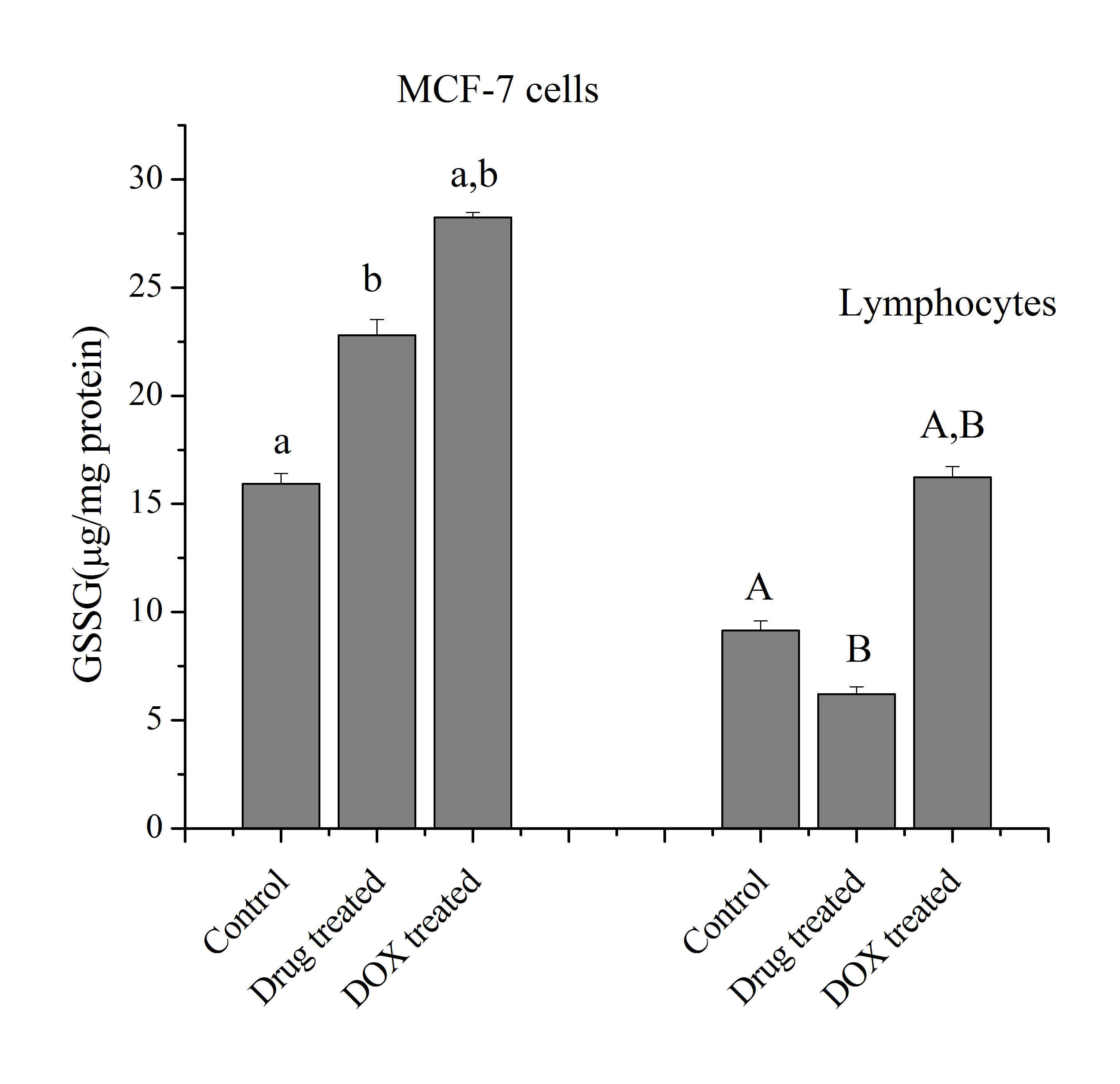 Fig. 3: Intracellular oxidized glutathione (GSSG) levels of drug-treated, DOX-treated, MCF-7 cells and lymphocytes. The levels of GSSG were expressed in term of mg of GSSG/mg protein, values are expressed as mean±SEM (n=6) of three experiments; superscripts indicate significant differences (P<0.05) compared with the control group