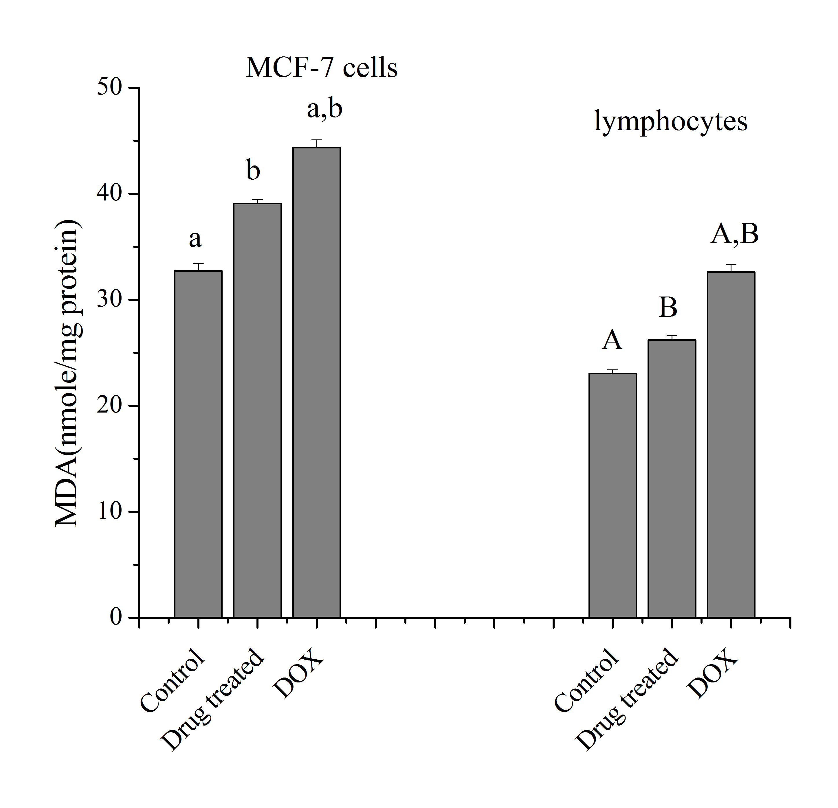 Fig. 4: Estimation of MDA levels of drug-treated and DOX-treated MCF-7 cells and PBLs. MDA level in terms of lipid peroxidation was expressed as n mole/mg protein, values are expressed as mean±SEM (n=6) of three experiments; superscripts indicate significant differences (P<0.05) compared with the control group