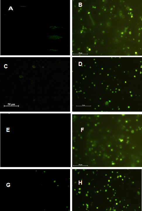 Intracellular reactive oxygen species measurement was done from DOX-treated MCF-7 cells and lymphocytes. The levels of ROS was considered as DCF fluorescence intensity and recorded by Fluorescence microscopic images Here E) Control MCF-7 cells F) DOX-treated MCF-7 cells G) Control lymphocytes H) DOX-treated lymphocytes.