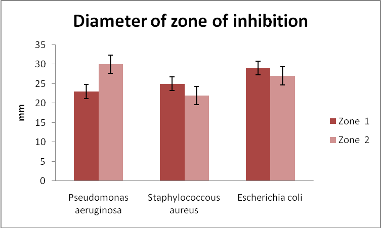 Fig. 6: Bar diagram represents the diameter of zone of inhibition on nutrient broth. Here, Zone 1: Standard antibiotic and Zone 2: green tea oil