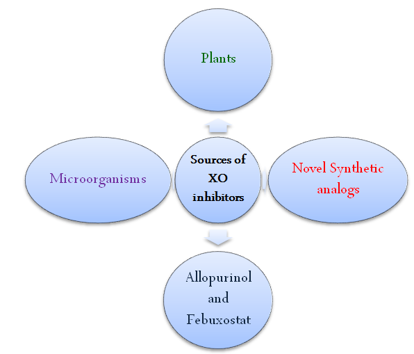 Since several decades XOI has been screened and synthesized from various sources (fig. 1). Selected microorganisms, including bacteria, fungi, and yeasts have been globally studied for the bio-synthesis of economically valuable preparations of various enzymes and enzyme inhibitors for commercial applications [25, 26]. In view of their medicinal potential, they have been screened for the isolation of XOI.