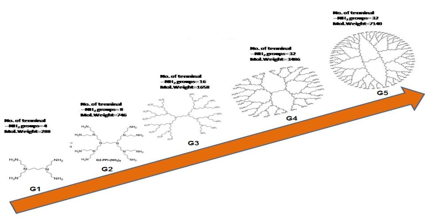 Dendrimers contain three distinct regions in their architecture including core, branches and peripheral functional groups. The core of dendrimers comprises an atomic group with two or more identical chemical functions while branches derive from core and wrapping of these branching units organize a geometrical progression of a sequence of radially concentric coats called "generations" (fig. 1,) [12, 13]. Repetition of branching layers leads to subsequent higher generations. With each consequential generation the number of terminal groups increases exponentially. In dendrimers, successive addition of each layer gradually increases diameter as well as molecular size with amplification of terminal groups.