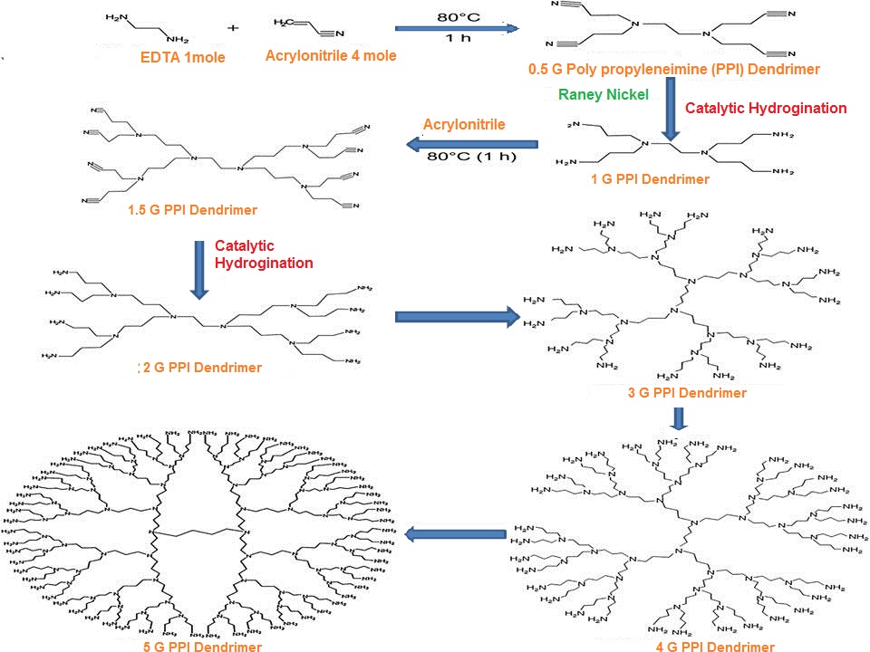 Half generation of PPI dendrimer was produced by addition of acrylonitrile in aqueous EDTA solution by double Michel addition reaction. This reaction was exothermic in which the temperature was increased from 38 °C to 80 °C and was maintained during the whole reaction. This resultant half generation PPI dendrimer had–CN terminated ends. Then, it was subjected to heterogeneous hydrogenation with catalyst Raney Nickel to synthesize a PPI dendrimer of the full generation having amine terminated ends. The whole process involving the addition of acrylonitrile and subsequent hydrogenation was repeated till 5G PPI dendrimer was synthesized. The synthesized generations of PPI dendrimers were subjected to structure elucidation, FT-IR and H1-NMR spectroscopy followed by microscopical examination using transmission electron microscopy.
