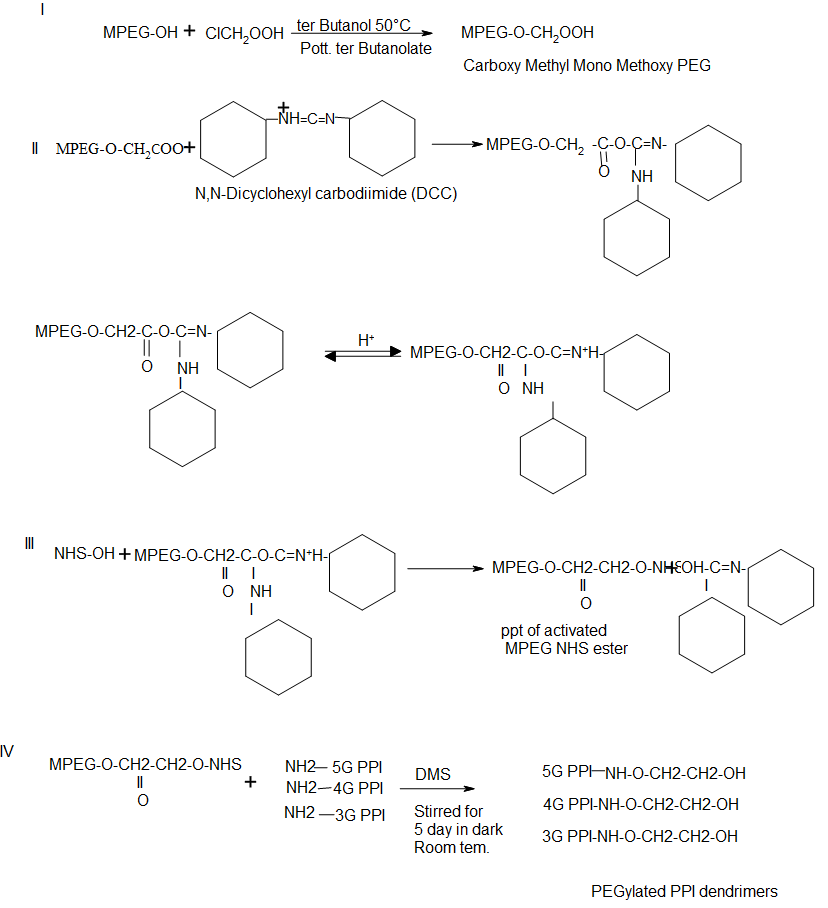 The PEGylation of the developed formulation was carried out using NHS ester derivative of MPEG-5000 as per the scheme depicted in fig. 3. MPEG 5000 was converted in carboxy derivative in the presence of DCC into an ester derivative. The activated MPEG NHS ester interacted with terminal NH2 endings of dendrimer and masked all the open amino ends and thus leading to the development of biocompatible formulations.