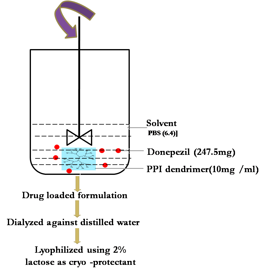 A known concentration of donepezil HCl (247.5 mg, 12 mmol) was dissolved in 50 ml of 6.4 pH of PBS buffer was slowly added with stirring and stirred for 15 min with a Teflon® bead. Then 1% solution (10 mg per ml) of each PEGylated 3G, 4G and 5G PPI dendrimers were prepared and 2 ml of this solution was dialyzed in dialysis membrane (MW Cut-off [MWCO] 6,000-7,000 Da, Sigma) with 50 ml of 6.4 pH of PBS buffer solution on 50 rpm for 24h for encapsulation of donepezil to PPI dendrimers (fig. 4).