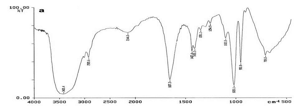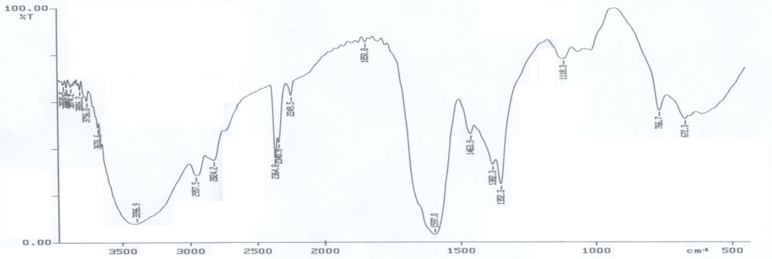 As per reported procedure of De Brabender Van Den Berg [8, 14], different generations of PPI dendrimers were synthesized in ethylenediamine used as initiator core. Synthesis of 0.5G PPI was confirmed by a strong IR peak of nitrile at 2248 cm-1. On hydrogenation all the nitrile terminal, 0.5G PPI got converted to (NH2)4, which was confirmed by IR of PPI 1.0G that exhibited major peak at 3374 cm-1 for amine (N-H stretch). Similarly, synthesis of 5.0G PPI dendrimers was also confirmed from different IR peaks. The main peaks were CH2 rocking (766.7 cm-1); C-N stretching of CH2-NH2, (1118.3 cm-1); CH2 scissoring (1382.3 cm-1, 1463.9 cm-1); N-H bending (scissoring) vibrations (1597 cm-1) and primary amine at 3397 cm-1 (N-H stretch), confirming that nitrile terminal groups of dendrimer were converted to amine terminals. The results matched with the reported synthesis of PPI dendrimers [15, 16].