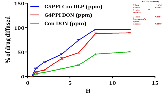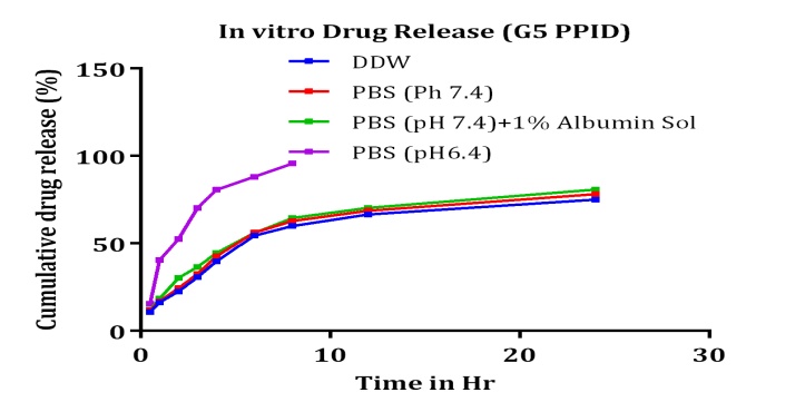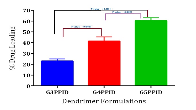 The G3 PPID indicated maximum drug leakage in comparison to higher generation due to its smaller size, but on the other side, that was unable to hold a high amount of drug. Generally, the lower generations have a low intensity of layer resistance for drug release or drug leakage and thus are expected candidates for easy drug release. While as the generations increase, proportionately the layer resistance for drug leakage also increase. Thus, confirming our data that the higher generation dendrimer was the most versatile.