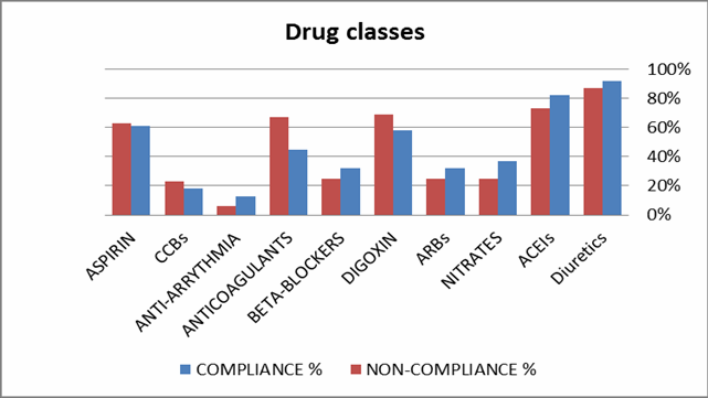 The distribution of drug class according to compliance status is presented in fig. 1. It was found that patients had the highest percentages of compliance with diuretics, ACEIs, nitrates, ARBs, beta-blockers, and anti-arrhythmic drugs (92%, 82%, 37%, 15.8%, 32%, and 13%, respectively). On the other hand, it was shown that patients had the highest rates of non-compliance to digoxin (69%), anticoagulants (67%), CCBs (23%), and aspirin (63%).