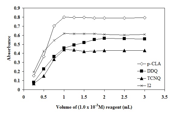 The results for variation of reagent concentration, indicated that 1.0 and 2.0 mL of (1.0 x 10-3 M) (I2, p-CLA or TCNQ) and DDQ, respectively are suitable. The higher concentrations of the reagents may, on the other hand, be useful for rapidly reaching equilibrium and complete color development, the results are given in (fig. 5). This minimizes the time required to attain the maximum absorbance at the corresponding wavelength of the charge transfer complexes.