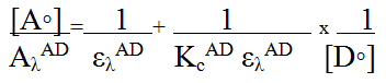 Where [Ao] and [Do] are the total concentrations of the interacting species, AλAD and ελADare the absorbance and molar absorptivity of the complex at their λmax, and KcAD is the association constant of the complex. On plotting the values of [Ao]/AλAD versus 1/[Do], a line was obtained with slope equals ً(ελAD KcAD)-1 and intercept of this line with the ordinate is (ελAD)-1.