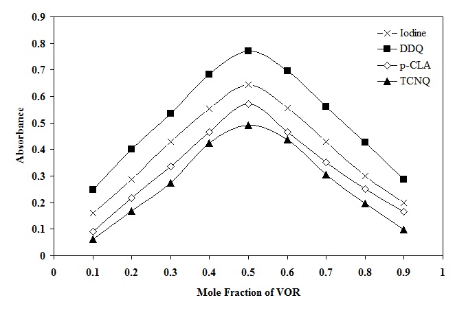 Fig. 6: Continuous variation plots for the reaction of VOR with Iodine, p-CLA, DDQ and TCNQ. λ= 364, 538, 461 and 840 nm, respectively. Total molar concentration = 1.0 x 10-4 mol L-1