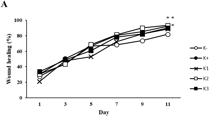 Based on fig. 1(A) and 2, there was an increase in the wound healing percentage, the largest percentage of healing occurred in K2 (the group of water fractions), followed by K+(gentamicin group). The lowest percentage of wound healing occurred in K-(aquadest group). Percentage difference of wound healing occurred from day 1 to day 11. The highest percentage of wound healing on day 1 was the K3 (33.73±4.4%) and on day 3 was K+(50.46±6.3%). The top percentage of healing on day 5, 7, 9, and 11 were K2 with the percentage of 68.73±2.7%, 81.31±1.8%, 90.08±2.3% and 93.4±1.3%.