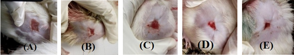 Fig. 2: Wound area on day 11 before termination, (A) Control; (B) Gentamicin; (C) Ethyl acetate fraction; (D) Water fraction; (E) n-hexane fraction