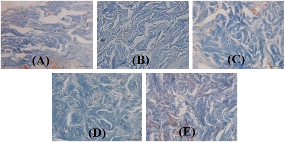 Fig. 3: Photomicrographs of rat skin tissues cross-section with Masson's trichome staining (collagen was distinguished from others by blue color) in 400x magnification, (A) Control; (B) Gentamicin; (C) Ethyl acetate fraction; (D) Water fraction; (E) n-Hexane Fraction