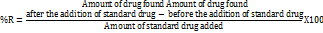 | S. No. | level | Amount of drug in the sample (µg/ml) | Amount of standard drug added (µg/ml) | Amount of drug recovered (µg/ml) | %Recovery |