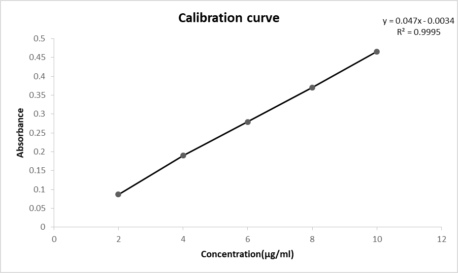 Calibration curve was performed in the concentration range of 2-10 µg/ml. Regression coefficient (R2) was found to be 0.9995.