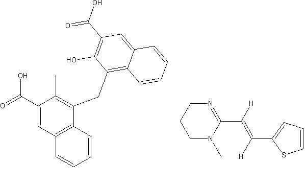 PP chemically designated as 1,4,5,6-tetrahydro-1-methyl-2-[(E)-2-(2-thienyl)vinyl] pyrimidine hydrogen; 4,4'-Methylenebis(3-hydroxynaphthalene-2-caroxylate) shown in fig. 1b acts as a depolarizing neuromuscular blocking agent causing sudden contraction, followed by paralysis of the helminths. It is freely soluble in ethanol, methanol, acetone, dimethyl sulfoxide and slightly soluble in DMF. The molecular weight is 594.7 and the empirical formula is C34H30N2O6S.