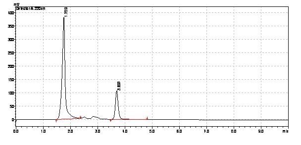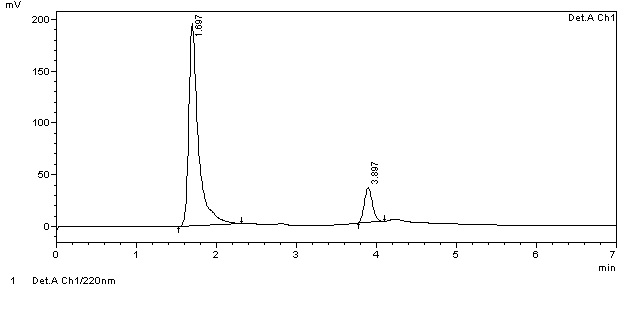 RP-HPLC (Shimadzu, Japan) equipped with an SPD 20A UV-Visible detector, LC-20AT pump and a manual Rheodyne injector with 20 μl loops. Column to be used was Phenomenex Luna C18 column (250 mm × 4.6 mm id, 5 μ particle size). Data were processed using Shimadzu LC solution software. The mobile phase was pumped at a flow rate of 1.0 ml/min and UV detection at 220 nm as shown in fig. 2. Ultra Sonicator (Dakshin, Sakinaka, Mumbai) and Digital analytical balance (AUX 220, Shimadzu, Japan) were also used.