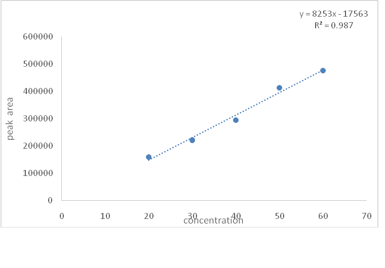 Linearity study was performed from 20-60 μg/ml for PZQ and PP in a combination. Suitable concentrations are obtained by diluting the stock solution of the drugs. These solutions are chromatographed. 20 μl of each of the standard solution was injected into the HPLC system. From the chromatogram, the peak area for the drugs were taken. The linearity curve was plotted individually for PZQ and PP by taking a concentration on X-axis and their response factor on the Y-axis. The correlation coefficient (r2= 0.987 for PZQ and r2=0.997 for PP) of the regression was found almost equal to 1. Data obtained was presented in fig. 6 and 7.