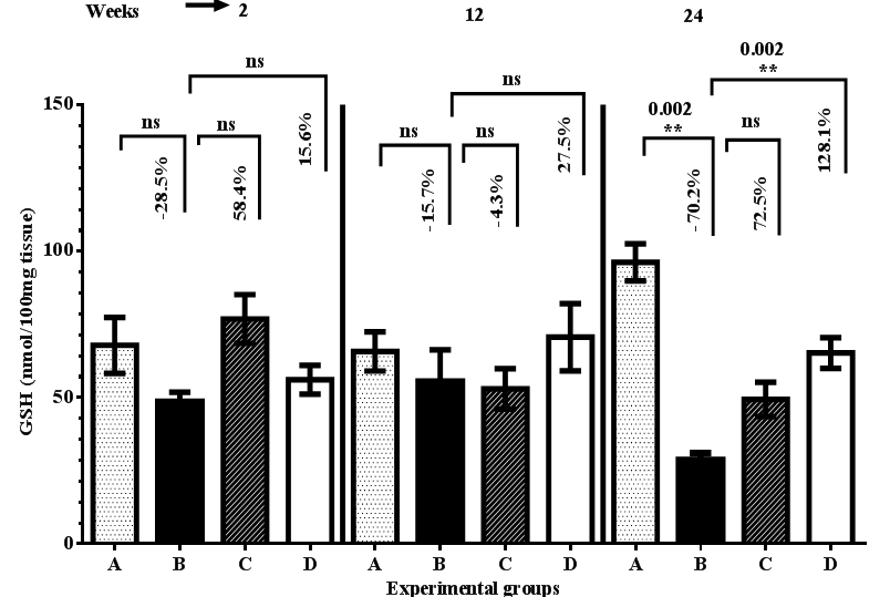 Administration of NDEA and PB (group B) decreased the levels of renal GSH from 67.8±9.5 to 48.5±3.3, 65.7±6.7 to 55.3±10.9 and96.1±6.3 to 28.6±2.3 nmol/100mg tissue at 2, 12 and 24 weeks of NDEA post-dose, respectively. However, sulphate polysaccharide supplements significantly up regulated GSH level by 58.4% and 72.5% (76.8±8.3 vs 48.5±3.3 and 49.3±5.8 vs 28.6±2.3 nmol/100 mg tissue at 2 and 24 weeks of NDEA post-dose, respectively, so it seems to be better than aqueous extract of U. lactuca, although the later up regulated the GSH level at 12 and 24 weeks greater than the former by 27.6%.