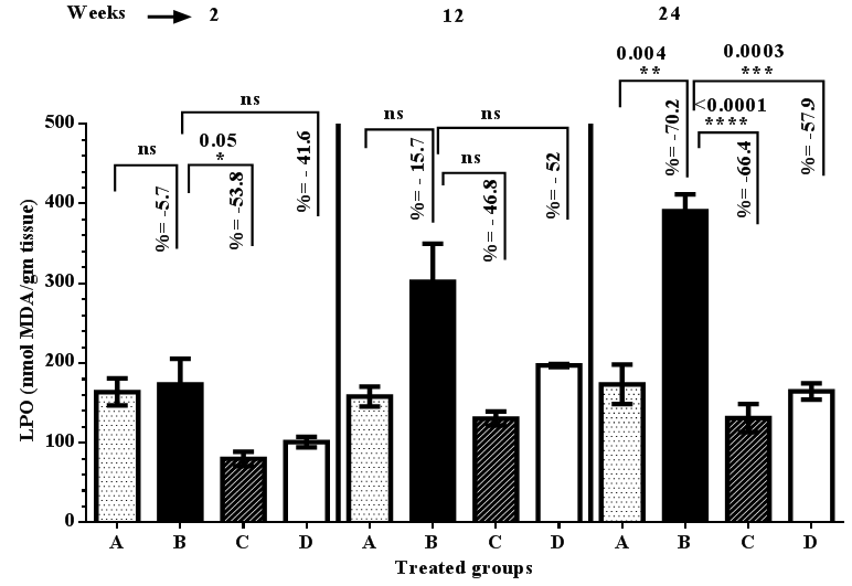 Administration of NDEA and PB significantly increased renal MDA levels in the group (B) rats along the entire periods of study. The MDA values of NDEA-treated group (B) in comparison to normal were(301.6±47.8 vs 166.6±16.8 and 390.5±20.9 vs 173.1±24.7 nmol MDA/gm tissue) at 12 and 24 weeks of NDEA post-dose), respectively. Otherwise, administration of sulphated polysaccharide has been shown a decline in MDA by-53.8%,-46.8% and-66.4% ((79.9±8.9 vs 173.1±32.3, 160.4±17.6 vs 301.6±47.8 and 130.9±17.6 vs 390.5±20.9 nmol MDA/gm, (P= ns, 0.02 and<0.0001)) at 2, 12 and 24 weeks, respectively. These findings indicate that sulphated polysaccharides seem to be more efficient than aqueous extract of U. lactuca.