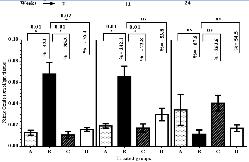 Nitric oxide levels were significantly increased in renal tissues of NDEA-intoxicated rats (0.068±0.01 and 0.065±0.009 µmol/gm tissue, P<0.01, respectively) at 2 and 12 weeks post-dose, and then non-significantly declined again at 24 weeks). Otherwise, administration of sulphated polysaccharides significantly (P<0.01) decreased NO level by-85.2% and 73.8% (0.01±0.007 vs 0.068±0.01 and 0.017±0.003 vs 0.065±0.009 µmol/gm) at 2 and 12 weeks NDEA post-dose, respectively.