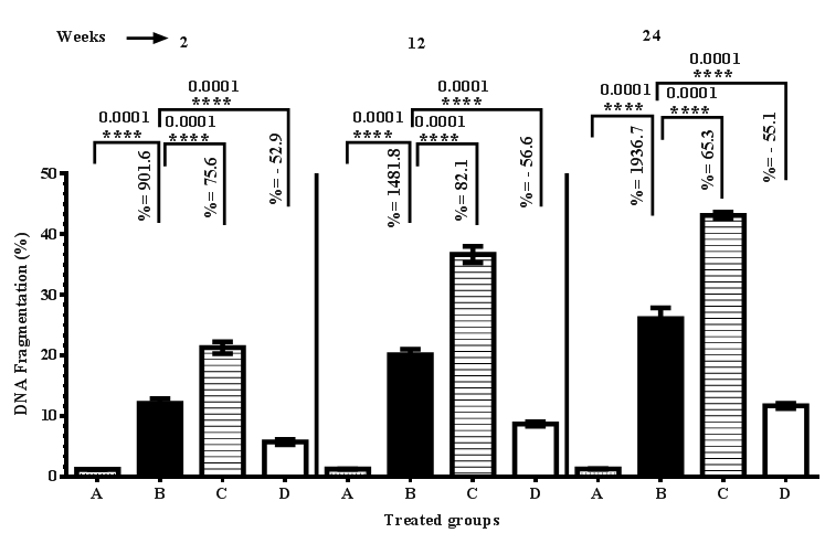Based on fig. (4) we can conclusively say that rats-NDEA dosing causes moderate significant increase in apoptotic-DNA damage of renal cells vin comparison to normal rats. Furthermore, the adverse effect of NDEA and the tested agents on renal DNA damage-based apoptosis of various groups at different time points (2, 12 and 24 weeks) are illustrated. Data are showing that normal rats induced moderately non-significant increase of renal apoptotic-DNA damage a long time, while significant (P<0.0001) effect for intoxicated treated ones. The deleterious effect of NDEA caused moderately significant (P<0.0001)increases of apoptotic-DNA damage as a reverse action of the cell after 2, 12 and 24 weeks, respectively, as compared with their normal group. Otherwise, NDEA-intoxicated treated groups with sulphated polysaccharide seem to be more efficient than the other treatment in the abrogation of DNA to be transcribed and arrest the cell before entering mitosis by elevation of apoptosis by 75.6, 82.1 and 65.32% at the selected time points of study.