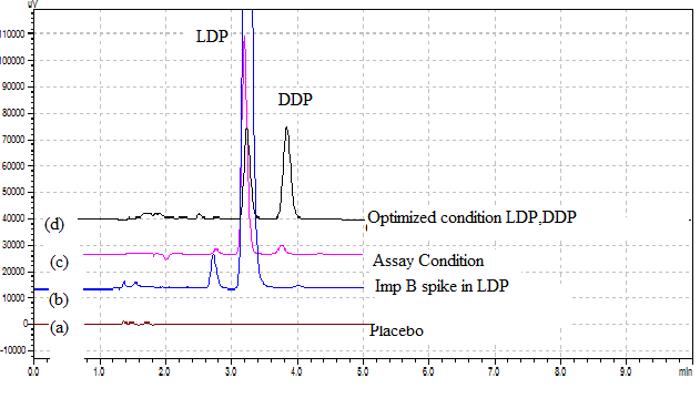 To investigate the appropriate wavelength for simultaneous determination of LDP, DDP, solutions of these compounds in mobile phase were scanned by UV–visible spectrometry (Shimadzu, Japan; model UV-1601 PC) in the range of 200-300 nm. The compounds were showing wavelength choices considered monitoring the drugs were around 254 nm. The CRS mixture of LDP, DDP were injected in to HPLC with PDA detector, recording the peak purity from 229 nm to 279 nm. It was observed there was no interference from the mobile phase or baseline disturbance at 254 nm with peaks LDP, DDP having tR of ~3.05 min. and ~3.66 min. Respectively. It was, therefore, concluded that 254 nm, as the most appropriate wavelength for the compounds (Fig.4) with suitable sensitivity.