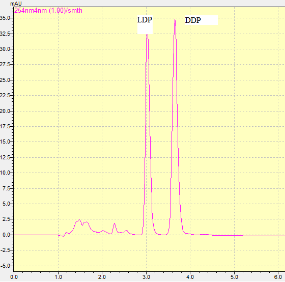 Fig. 6: Chromatogram obtained at 254 nm following the injection of 20 µl of a solution containing 10µg of CRS mixture (LDP and DDP)