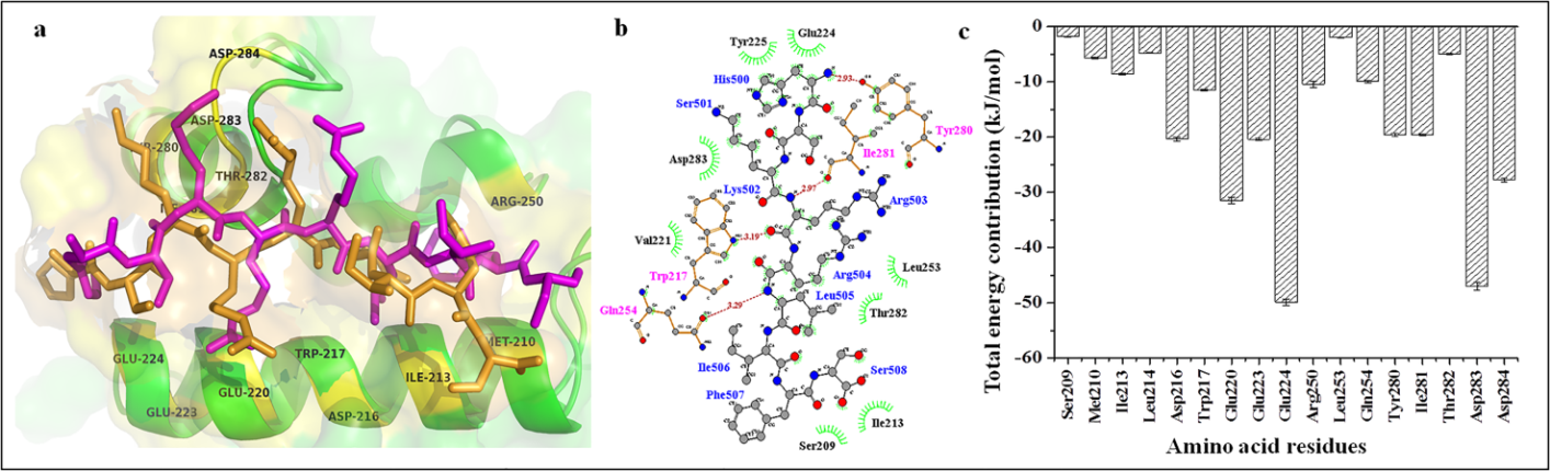 Fig. 1: Docking and simulation analysis of WILD p21 peptide. (a) The binding pose of the p21 peptide after docking (magenta) and molecular dynamic simulation (orange). Interacting amino acid residues have been highlighted in yellow. (b) LigPlot plus based interaction analysis of cyclin A/WILD peptide complex. (c) Per-residue energy decomposition analysis of cyclin A/WILD peptide complex. Amino acid His500–Ser508 of WILD/K3C peptide in the LigPlot plus 2D representation corresponds to His1–Ser9 (in reference to other sections of the manuscript)