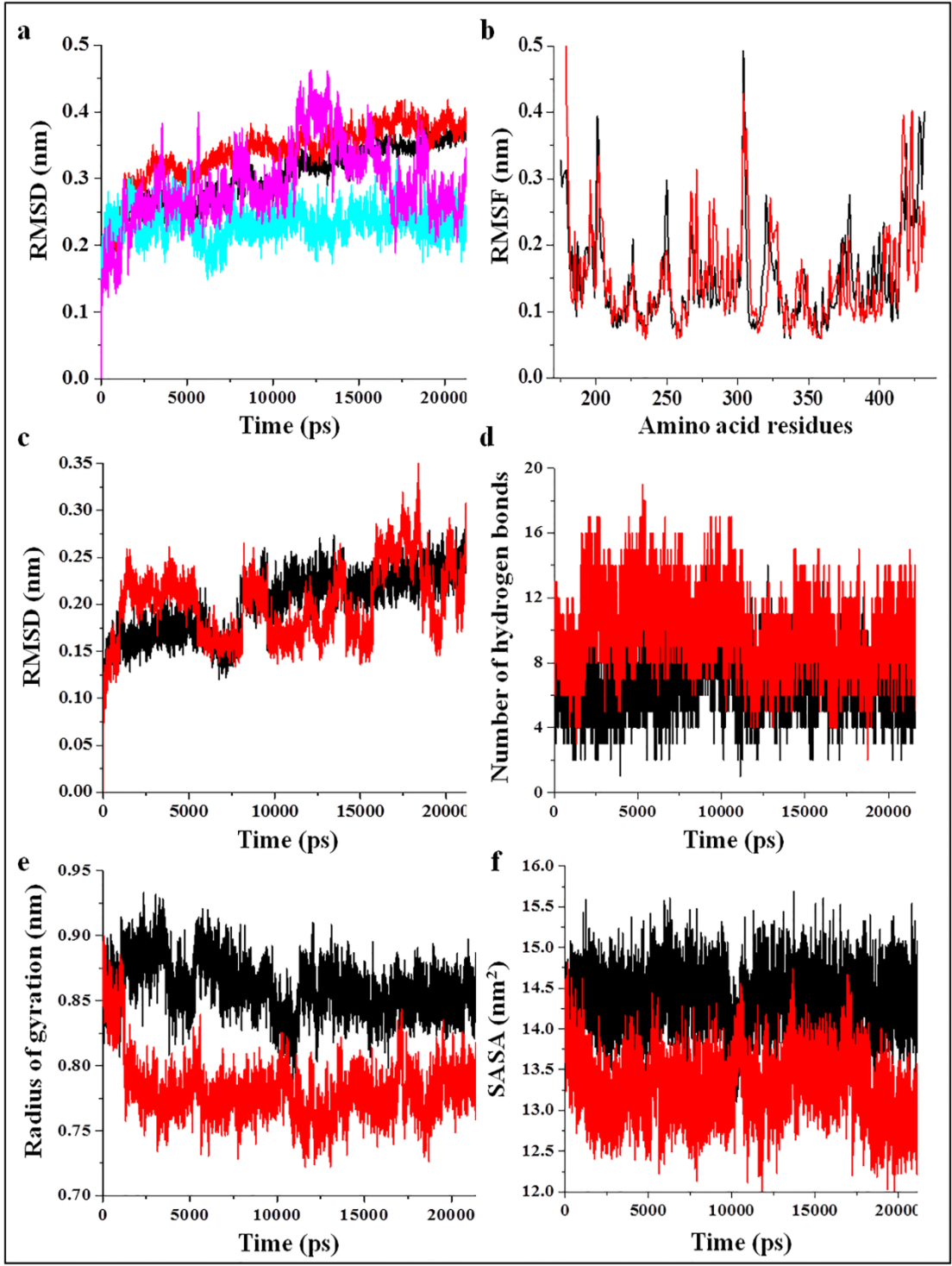 Fig. 2: Simulation-based evaluation of the binding interaction of WILD/K3C peptide with cyclin A. (a) RMSD plot of cyclin A protein (black and red), WILD (cyan) and K3C peptide (pink). (b) RMSF plot of cyclin A protein. (c) RMSD plot of substrate binding groove residues (Ser209, Met210, Ile213, Leu214, Asp216, Trp217, Glu220, Glu223, Glu224, Arg250, Leu253, Gln254, Tyr280, Ile281, Thr282, Asp283 and Asp284) of cyclin A. (d) Hydrogen bond plot of protein-peptide complex. (e) Rg plot of the WILD and K3C peptides. (f) SASA plot of the WILD and K3C peptides. Black and red lines correspond to WILD and K3C