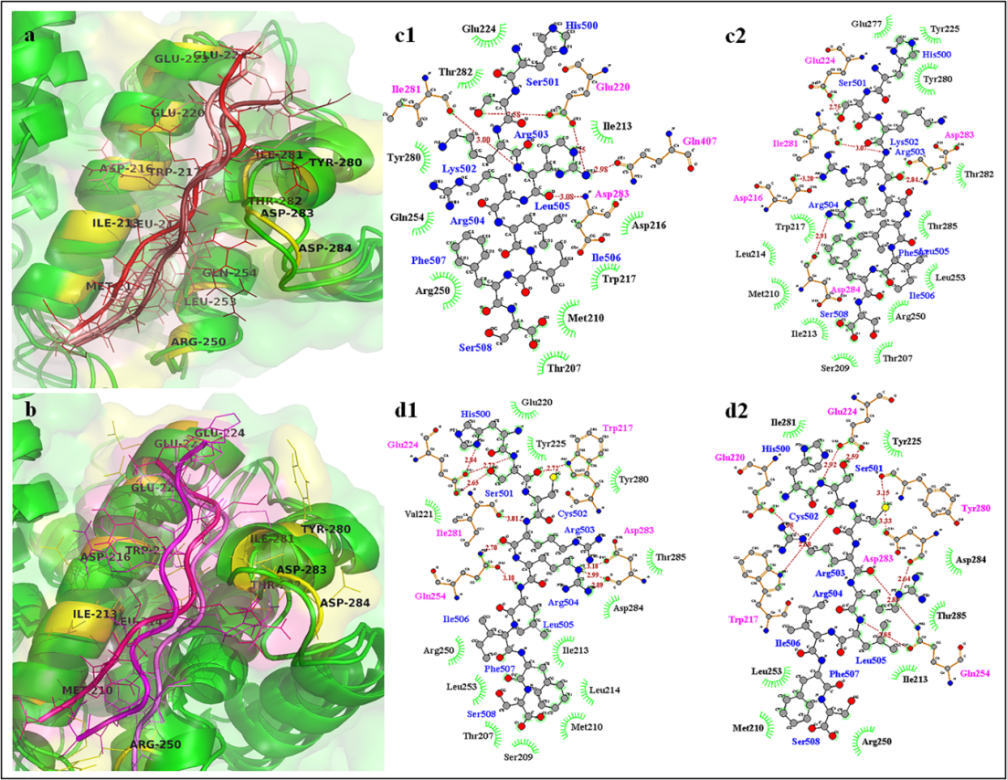 Fig. 3: Interaction analysis of cyclin A-WILD/K3C peptide complexes during simulation. (a) The structure of cyclin A (green) complexed with WILD peptide at 0 ns (red), 10 ns (salmon) and 20 ns (ruby). (b) Structure of cyclin A (green) complexed with K3C peptide at 0 ns (magenta), 10 ns (hot pink) and 20 ns (violet). (c) LigPlot plus based 2D interaction plot of the WILD peptide at 10 ns (c1) and 20 ns (c2). (d) LigPlot plus based 2D interaction plot of the WILD peptide at 10 ns (d1) and 20 ns (d2). Amino acid His500–Ser508 of WILD/K3C peptide in the LigPlot plus 2D representation corresponds to His1–Ser9 (in reference to other sections of the manuscript)