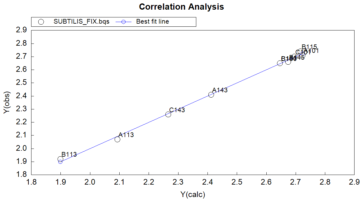 X1 and X5 were found on the selected variables; it shows the number of selected variables. In addition, the values of R, s, F, Q2, SPress, SDep were identified. The selection was based on the best statistical parameters including the highest R (regression), the largest F ratio, the smallest s value, the smallest PRESS statistic (the predicted residual sum of squares), and the lowest Q2. The calculation of MLR of the descriptors of S. aureus, B. subtilis and E. coli using BuildQSAR provides 4 QSAR models as shown in table 2, table 3, and table 4.