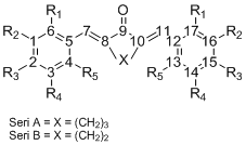 Based on the equation 1 in table 4, to generate the best antibacterial activities against E. coli. The charge of atom C2, C11 and C12 must be negative for small Log IC50. The negative charge of atom C2 can be generated by adding electronegative substituents such as–OH and-OR. To influence the negative charge of atom C11 and C12, either hydroxyl or halogen was added to atom C13 and C17 due to its resonance effect that can make the charge of atom C9 and C14 more negative. The numbering structure of atom C in the basic structure is shown in fig. 3.