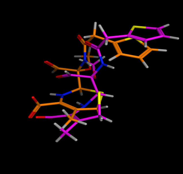 Fig. 4: Alignment of native ligand (purple) and docked ligand (yellow)